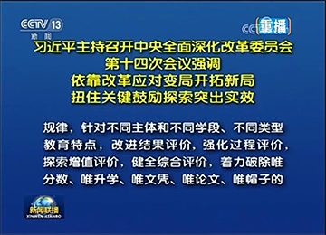 新华社北京2020年6月30日电 中共中央总书记、国家主席、中央军委主席、中央全面深化改革委员会主任习近平6月30日下午主持召开中央全面深化改革委员会第十四次会议并发表重要讲话。会议指出,教育评价事关教育发展方向,要全面贯彻党的教育方针,坚持社会主义办学方向,落实立德树人根本任务,遵循教育规律,针对不同主体和不同学段、不同类型教育特点,改进结果评价,强化过程评价,探索增值评价,健全综合评价,着力破除唯分数、唯升学、唯文凭、唯论文、唯帽子的顽瘴痼疾,建立科学的、符合时代要求的教育评价制度和机制。